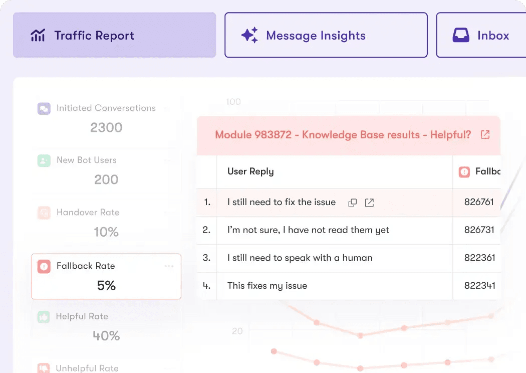 Our AI chatbots don’t just answer questions—they gather feedback, reveal product gaps, and surface new feature ideas. With our analytics tools, you can easily spot patterns in customer behavior, monitor key metrics like fallback and helpfulness rates, and understand where your customer journey needs work.